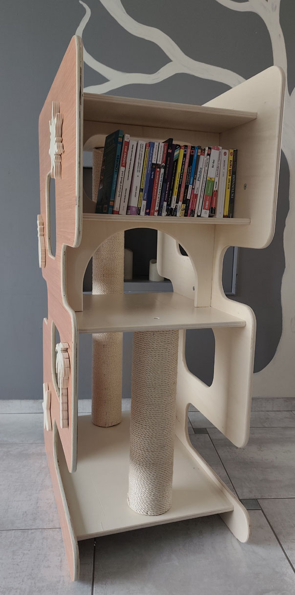 Un espace de jeu et de repos adapté à ses besoins avec un arbre à chat spacieux et fonctionnel avec un petit coin bibliothèque ou DVD si vous le souhaitez.
